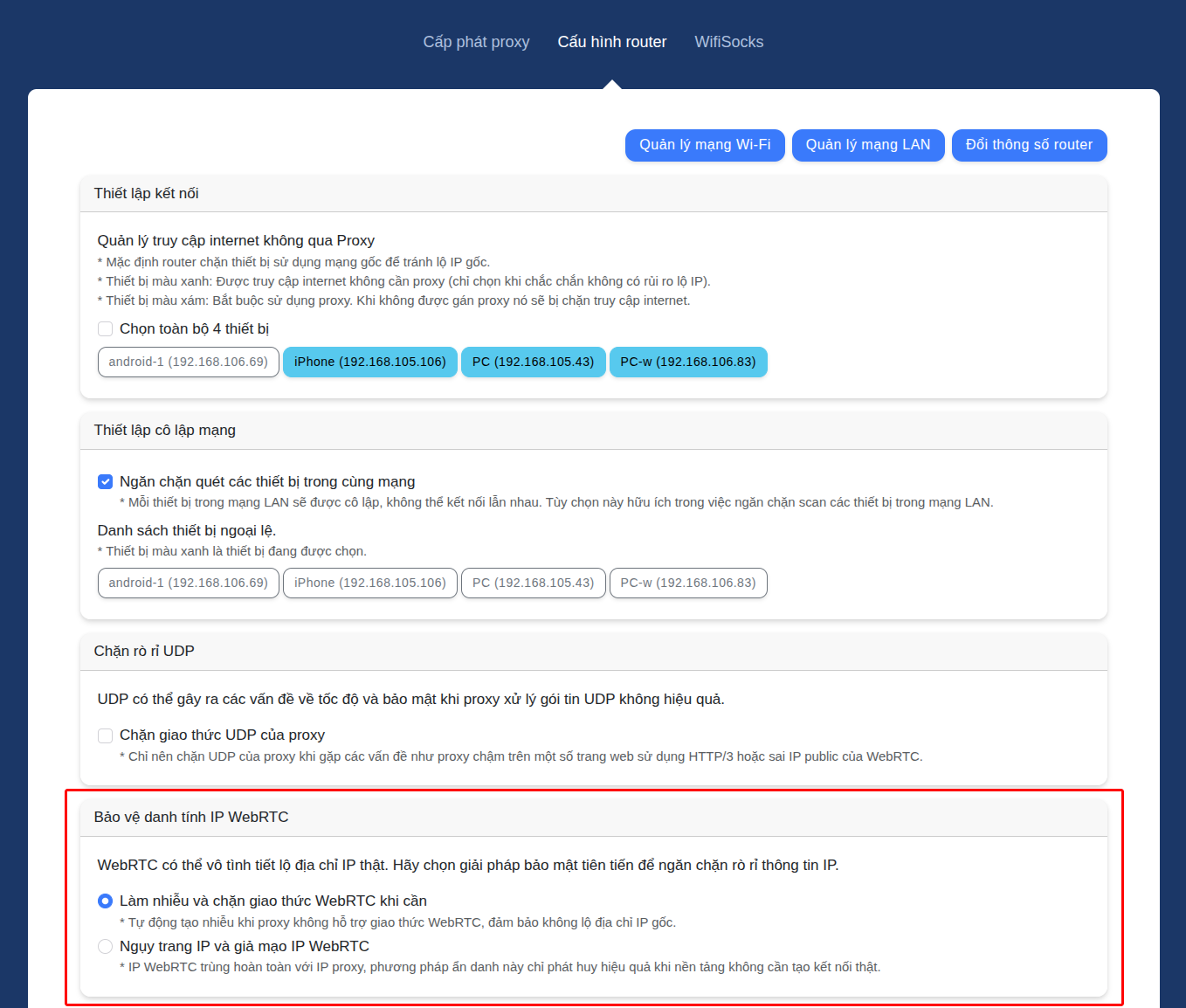 Để bảo vệ quyền riêng tư, bạn có thể cấu hình WebRTC trên router WifiSocks như sau: